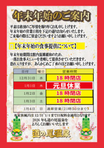 年末年始期間の営業スケジュールおよび食事提供について、下記の通りご案内申し上げます。